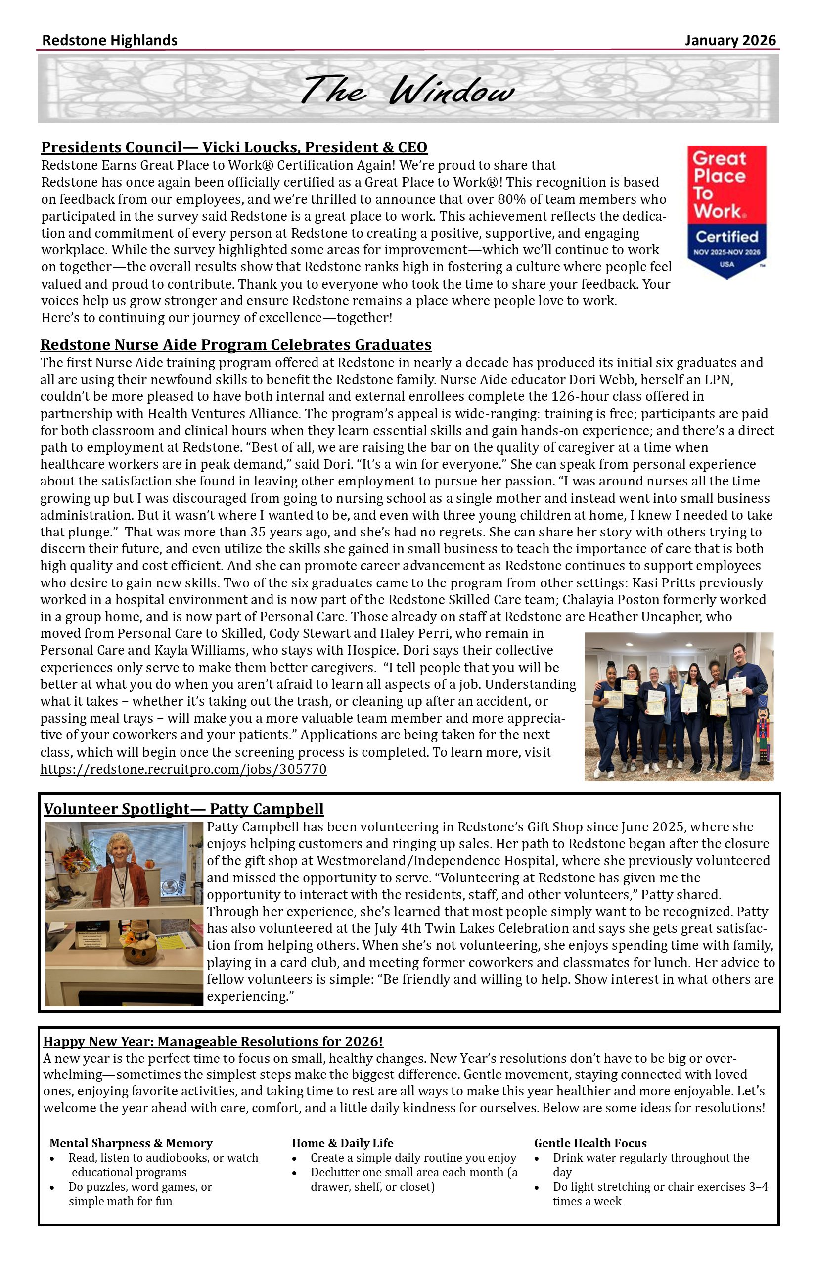 Redstone Highland’s “The Window” is a monthly newsletter for our residents. It keeps people up-to-date on the latest events, fundraisers, COVID news, resident spotlights, and more.
